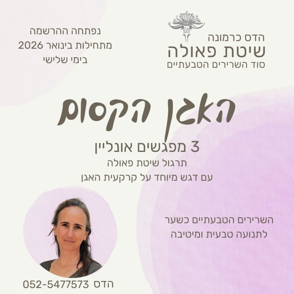 את מוזמנת להצטרף לסדנה מיוחדת המאפשרת ללמוד ולהכיר את קרקעית האגן דרך התנסות ייחודית בהשראת שיטת פאולה. על ידי תרגילים פשוטים כמו כיווץ, שחרור, איסוף, פתיחה, תנועה מעגלית ודימויים נעיר את תשומת הלב לפעילות הקרקעית.